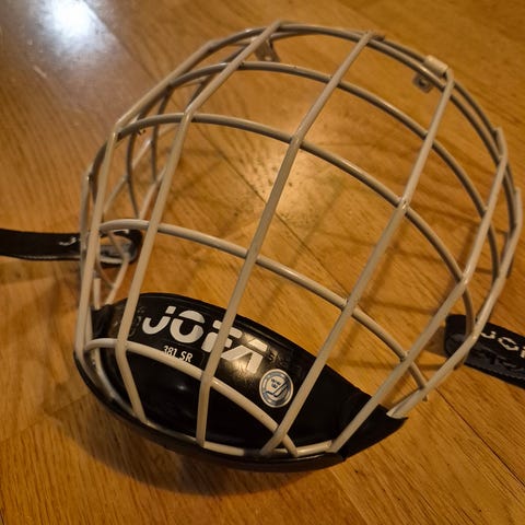 Jääkiekko kasvosuojaristikot; Jofa valkoinen, Reebok ja Bauer harmaa.