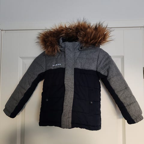 Lasten talvitakki, koko 104. Takissa on harmaa-musta kuviollinen pinta ja sininen vuori hupun sisällä. Mallissa on irrotettava huppu, etuvetoketju sekä etutaskut, joissa on heijastinyksityiskohtia. Hihansuut ovat kuminauhalla. Sopii ulkoiluun ja talvikeleihin lapselle, joka käyttää kokoa 104.