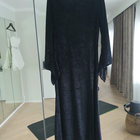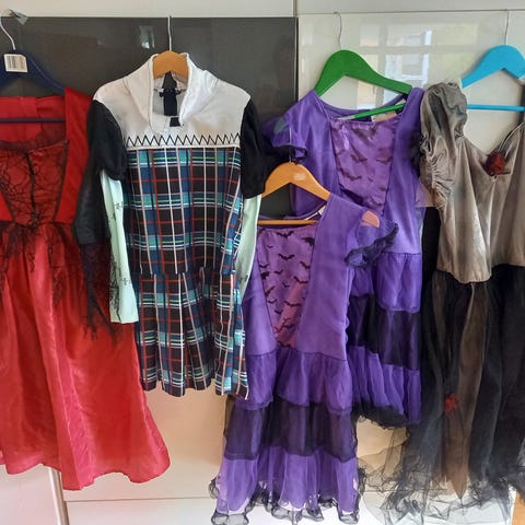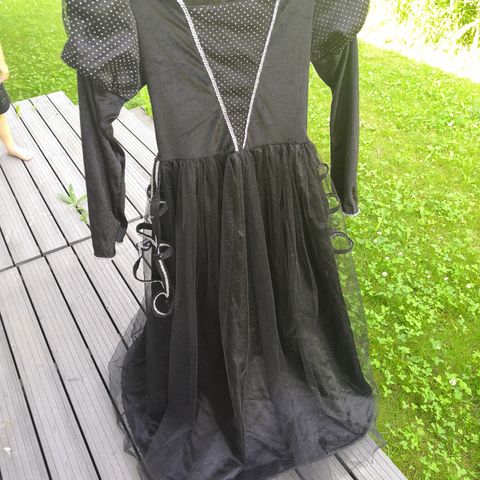 Noitamekko seuraavalle lapselle. Käytetty vain kerran meillä ja pari edellisellä omistajalla. Mekossa on musta, pitkähihaisen yläosa ja monikerroksinen liila-oranssi tyllihame, jossa on lepakkokuvioita ja epäsymmetrinen helma. Sopii esimerkiksi naamiais- tai halloween-asuiksi. Materiaali vaikuttaa olevan joustavaa kangasta ja tylliä. Kokoa ei puvussa lue, mutta arvelen, että on 104 tai sinnepäin. Ei ainakaan enää sitä isommalle.
