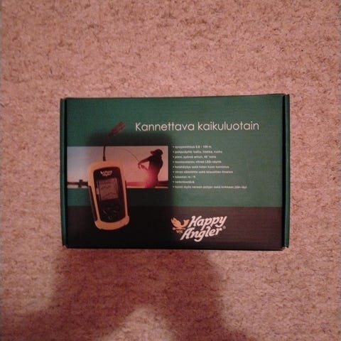 Happy Angler kannettava kaikuluotain. Laitteessa on kädessä pidettävä näyttöyksikkö ja erillinen anturi kaapelilla. Soveltuu kalastukseen ja veden syvyyden mittaamiseen, kalaparvien havaitsemiseksi. Pakkaukseen kuuluu luotainlaite, anturi johdolla, kelluke ja käyttöohjeet. Voimanlähteenä 4 paristoa AAA. Myymälän paristot eivät sisälly pakkaukseen.