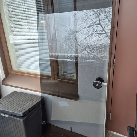 Myydään saunan lasiovi karmeineen. Karmin leveys 69cm, korkeus 177cm.