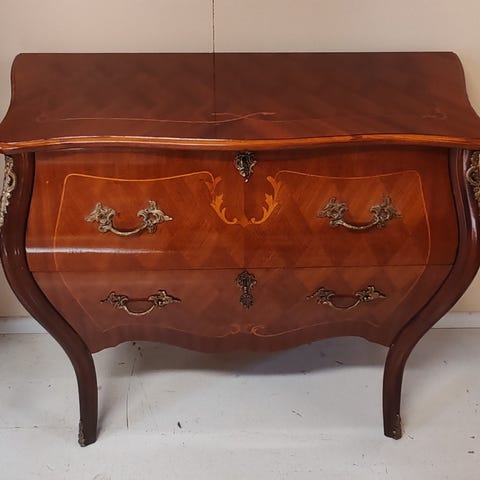 Rokokoo-tyylinen huonekalu, joka edustaa 1700-luvun eleganttia ja koristeellista muotoilua. Tyylille on ominaista kaarevat muodot ja koristeelliset yksityiskohdat.