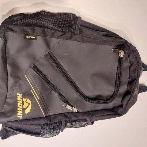 Musta Karhu pesisreppu. Siistikuntoinen käytetty. Mailalle mailapussi, tässä repeämä, kts.kuva. Maila kuitenkin pysyy hyvin pussissa. Muutoin ehjä reppu.
