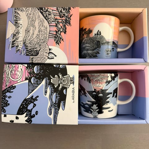 Arabia Muumi-muki on posliininen juomamuki, jossa on vaaleanpunasävyinen Muumi-aiheinen kuvitus. Muki soveltuu esimerkiksi kahvin, teen tai muiden kuumien ja kylmien juomien tarjoiluun arjessa ja kattauksissa. Kuvio jatkuu mukin ympärillä, ja mukana on kuvitukseen sopiva pahvinen lahjapakkaus.