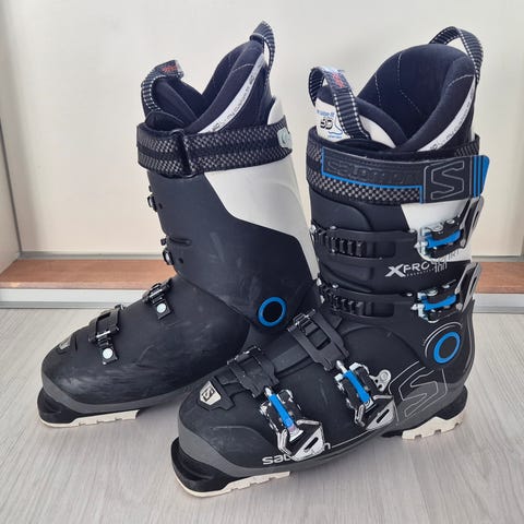 Salomon X Pro 120 laskettelumonot. Neljän soljen rakenne ja leveä power strap -remmi tarjoavat tukevan istuvuuden. Monojen kuori on musta–valkoinen vihrein yksityiskohdin. Sopivat rinnelaskuun. Ulkopuolella merkinnät X Pro 120 ja Salomon-logo.
