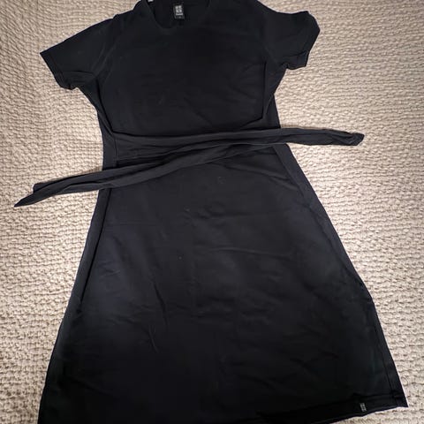 Kaikon trikoomekko. Kiinteä vyö, joka voidaan solmia eteen tai taakse. Haalistunut pesussa jonkun verran, mutta muuten hyvä käytetty kunto.