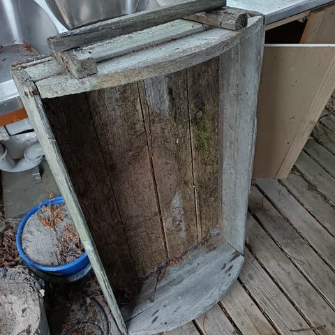 Vanha puinen laatikko, vastaava kuin emännän kaapin vetolaatikko.