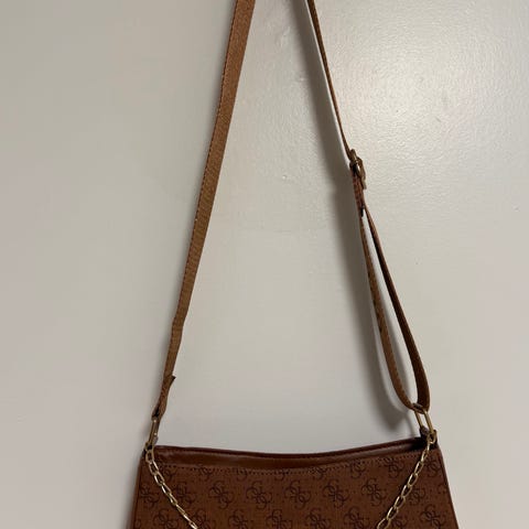 Beige-kuvioinen tekonahkainen käsilaukku, jossa Guess-logokuviointi ja pitkät kantokahvat. Laukun mukana irrotettava pienempi olkalaukku samasta kuosista. Pääosassa magneettikiinnitys ja sisällä vuorattu lokero, jossa sivutaskuja pientavaroille. Sopii arkilaukuksi ja pienen laukun ansiosta myös kevyempään käyttöön.