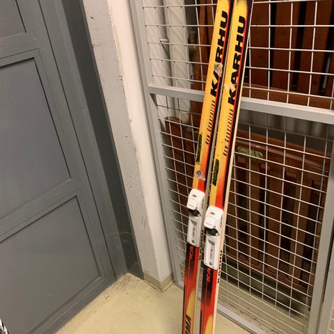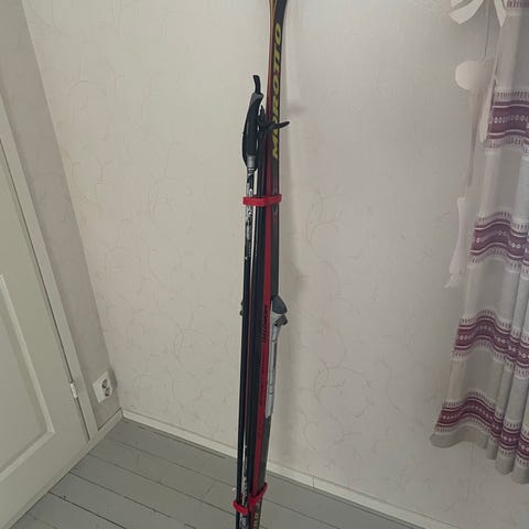Sport Splitken merkkiset maastohiihtosukset. Suksissa väritys sinisen ja neonkeltaisen sävyissä.