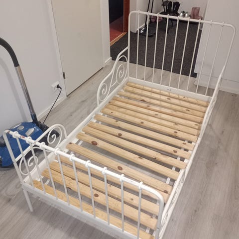 Kuultovalkoinen ehjä lasten sänky. Ehjä ja siisti. Ollut tarroja kiinni ja näköjään vielä yksi tarra liimattu huomaamatta. Ei patjaa. Pikainen nouto Kortepohja. Autetaan ulos hissitalosta.