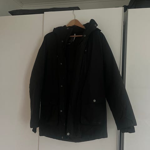 Väriltään vihertävä camo-tyylinen kuosi oransseilla vuorella ja yksityiskohdilla. Takissa on huppu ja vetoketjukiinnitys.