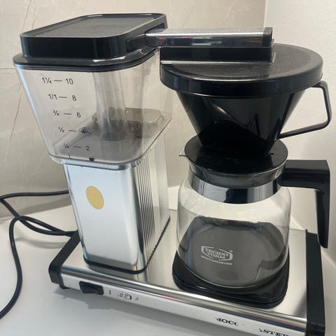 Toimiva ja hyväkuntoinen Moccamaster kahvinkeitin 10-kuppia / 1,25ltr ilman Auto-off virrankatkaisua. Muoviosat ehjiä, mutta manuaalitippalukko ei toimi.