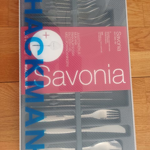Hackman Savonia aterinsetti, 24 osaa. Setti sisältää veitsiä 6kpl, haarukoita 6kpl, ruokalusikoita 6kpl ja kahvilusikoita 6kpl. Materiaalina on ruostumaton teräs. Aterimet soveltuvat arki- ja juhlakäyttöön ja ne voidaan pestä astianpesukoneessa.