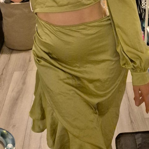 Tukevampi kangas alushameella. Taskut edessä. Tämä sopii parempaankin tilaisuuteen. Merkkiä en muista, koska lappu leikattu. Koko tiukka S.