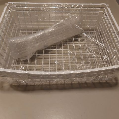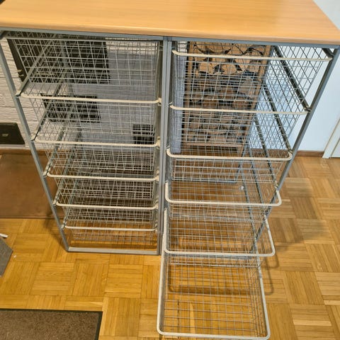 Valkoinen Norscan-lankakorijärjestelmä 4 hyllyllä; 3 syvää, 1 matala kori.