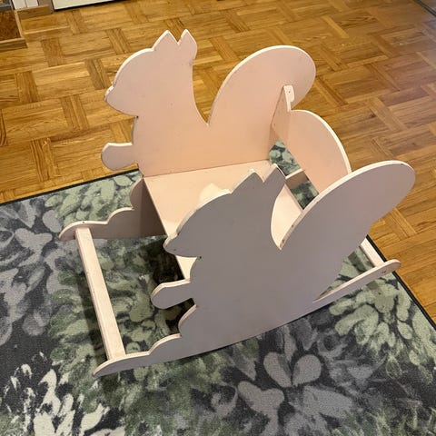 Ikea lasten keinutuoli. Kulumaa reilusti ja käsinojien kiinnitystä vahvistettu itse ylimääräisillä ruuveilla.
