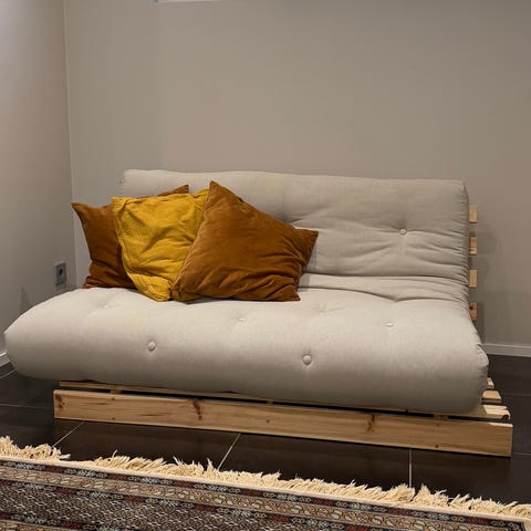 Erinomaisessa kunnossa Karup Design futonvuodesohva Roots 140. Väri vaalea pellava ’914 Linen’.