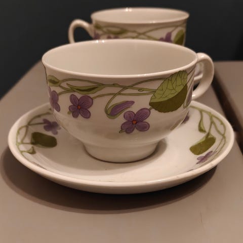 Siinä on käsinmaalattu (handmalte) koristeaihe, joka esittää kansanpukuisia hahmoja ja kukkakuvioita.