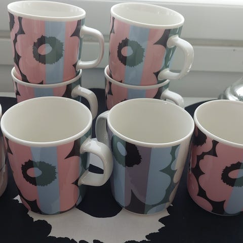Myynnissä kaksi Marimekon Unikko Ralli -mukia, jonka väritys on valkoinen, taivaansininen ja roosa. Isomman mukin vetoisuus on 4dl ja pienemmän mukin 2,5 dl. Molemmat ovat täysin käyttämättömät. Yhteishinta 40€.