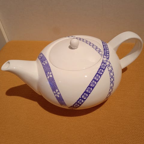 Keraaminen teekannu ja kaksi mukia, joissa hillakuviointi. Settiin kuuluu kannu kannella sekä kaksi korvallista mukia. Astiat sopivat teen tai muiden kuumien juomien tarjoiluun. Väri pääosin vaalea, sinisävyisellä ja keltaisella koristelulla.