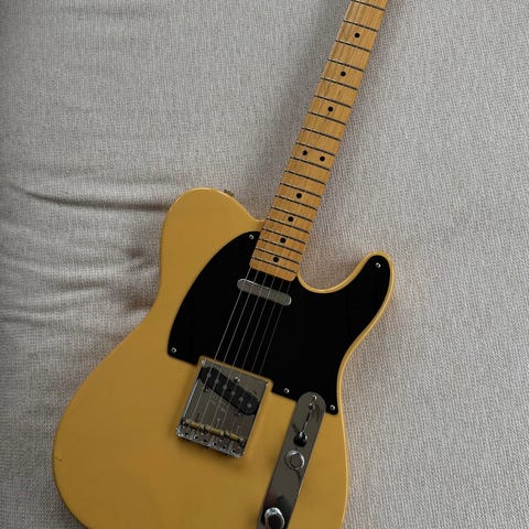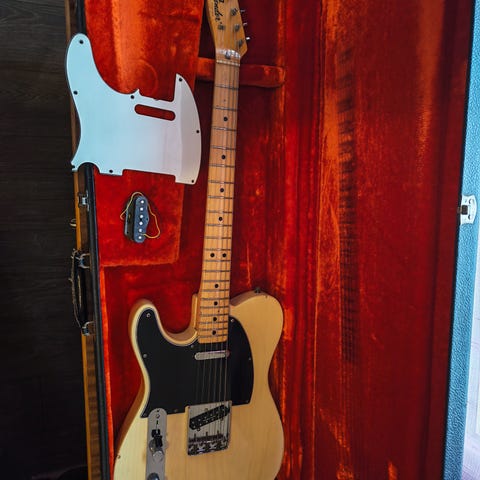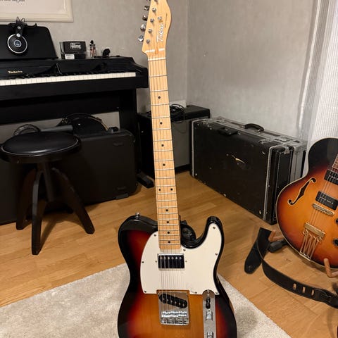 Erinomainen Telecaster jollekulle ketä telettää. Kitarassa on hieman tukevampi ja oikein sopivasti käden täyttävä Fender 1995 James Burton ltd.edit. kaula (Kaulan paksuus 1.nauhalta ja kielet päällä mitattuna 24mm) sekä huippulaadukas Tokai TTE-55 Japan Leppä body. Dimarzion DP172 Twang king toimii upeasti kaulamikkinä ja DP112 Pre-B1 tallassa. Kielinä tällä hetkellä tuore Daddario XL 11- 48 pure nickel setti.