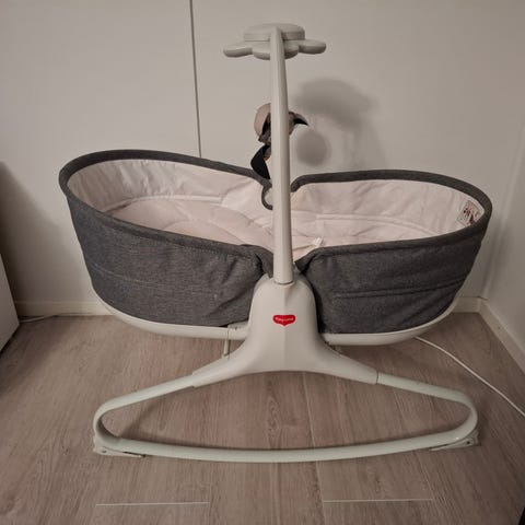 Turkoosiharmaa sitteri/keinu/sänky. Lelukaari soittaa musiikkia ja siinä vilkkuu valot. Sitterissä tärinätoiminto. Selkänoja mahdollista nostaa istuma-asentoon tai pitää makuuasennossa.