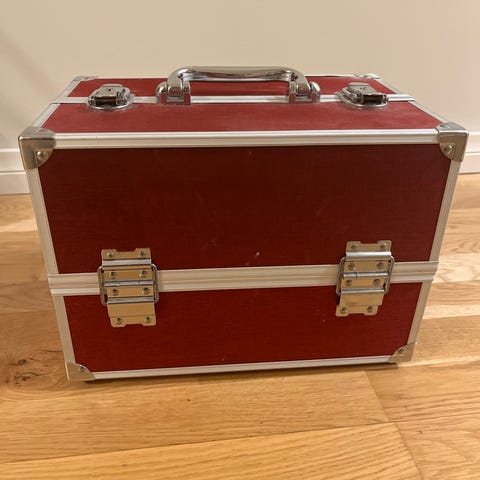 Turkoosi kovakantinen meikkilaukku metallivahvistetuilla kulmilla ja lukittavilla saloilla. Laukussa on kantokahva sekä useita sisäosia ja tasoja, jotka liukuvat auki sivuille ja ylös. Sisäpuoli on musta ja jaoteltu lokeroihin erilaisten meikkien, siveltimien tai muiden pienten tarvikkeiden säilyttämistä varten. Soveltuu esimerkiksi meikkien, korujen tai askartelutarvikkeiden järjestämiseen ja kuljettamiseen.