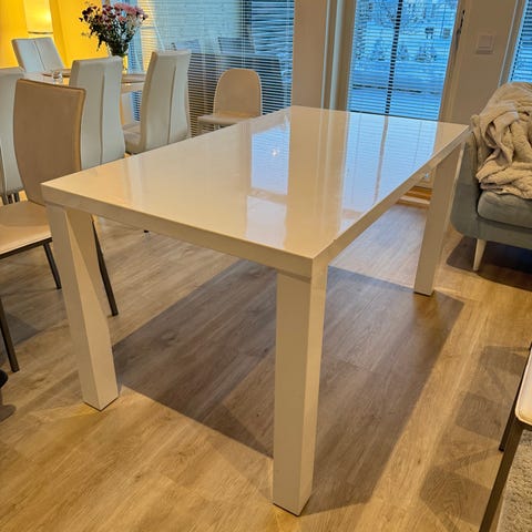 Korkeakiiltopöytä. Pöydän kannen pinnassa ei jälkiä, mutta jaloissa ja kulmissa löytyy kolhuja. Pituus 140cm leveys 90cm ja korkeus n. 75cm.