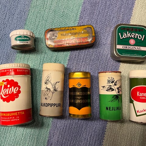 Vanha vintage retro peltipurkki pelti purkki peltipurkit purkit kuppi kupit emali emalikuppi vati kulho tarjoiluvati tarjoilukulho säilytys säilytysastia säilytyspurkki säilytyspurkit astia kippo ruskea sininen punainen kukka kukat kahvikuppi kahvikupit perhonen perhoset