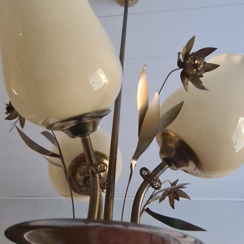 Vanhan ajan kattokruunu valkoisella lasikuvulla kolmella metalliketjulla. Valaisimen runko ja yläsuojakupu on myös metallia. 220 V 60 W E27 kanta.