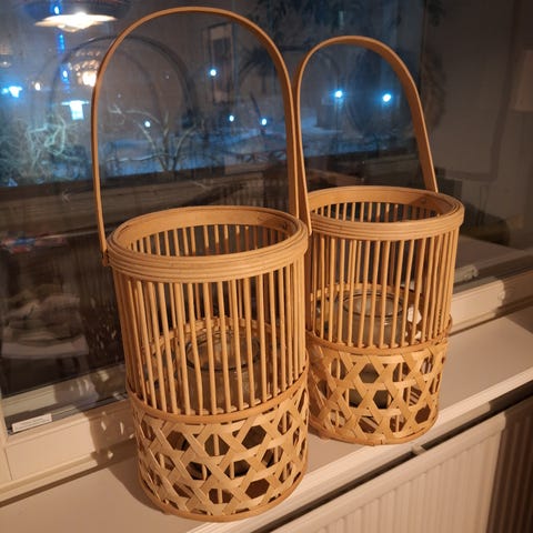 Siistikuntoinen rottinkinen kynttilälyhty. Lyhdyn sisällä ollut lasi puuttuu.