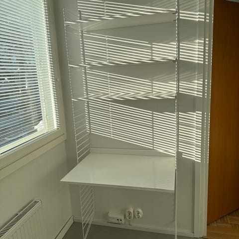 Myyntiin siistikuntoinen valkoinen string kokonaisuus: 3 hyllylevyä, työtaso ja kaksi korkeaa seinäpaneelia. Työpöytä käytöstä suoraan uuteen kotiin, kunto todella hyvä käytetty. Minimaalisia käytönjälkiä tarkasti katsottuna paneeleissa ja hyllyissä: paneeleissa tummentumaa hyllyjen kiinnityskohdissa, saanee putsattua ja ainakin yhden hyllylevyn reunassa huomasin kynän kärjen kokoinen kolhun. Työtasossa enemmän käytönjälkiä askartelusta ja pieni kohouma, kuitenkin päällisin puolin hyvin siisti ja käyttökelpoinen edelleen. Nouto Pirkkalasta, en myy osia erikseen.