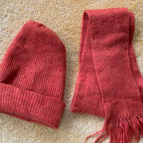 Oranssinruskea lämmin pipo ja kaulaliina / kaulahuivi, unisex, yht 11€