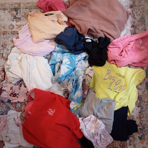 Hyväkuntoisia, puhtaita naisten vaatteita. Kaikki xs-s -kokoisia. Pari mekkoa, muutama lyhythihainen paita, pari toppia, muutama neule ja neuletakki, hame sekä farkut. Suurinosa puuvillaa. Nouto Kuokkalasta.