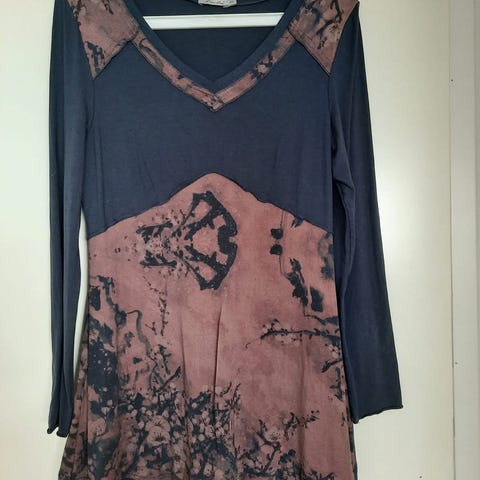 Tunikassa on käytön jälkiä, haalistumaa väreissä. Otin kuvia. Paita on jotenkin tosi kuva ja ehjä. Puuvillaa.