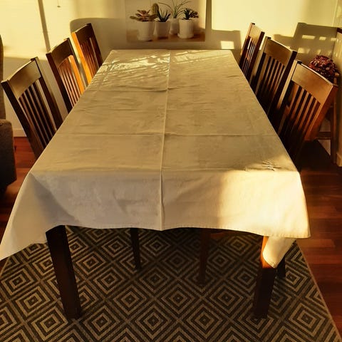 Kuviollinen vaalea pöytäliina suorakaiteen muotoiselle ruokapöydälle. Sopii useamman hengen ruokapöytään, kuten kuvassa näkyvään pitkään pöytään. Pöytäliina soveltuu arki- ja juhlakäyttöön ruokailutilaan tai olohuoneen pöydälle.