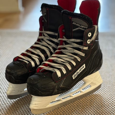 Bauer jääkiekkoluistimet, koko 40,5. Väri pääosin musta valkoisilla ja punaisilla yksityiskohdilla. Soveltuvat jääkiekkoon ja muuhun jäällä luisteluun. Mukana teräsuojat.