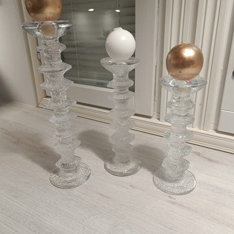 Sarpaneva Iittala Festivo lasiset kynttilänjalat kirkas. Kaksi erikorkuista, kirkkaasta puristelasista valmistettua kynttilänjalkaa. Sopivat pöytäkynttilöille tai pallokynttilöille. Ajaton muotoilu toimii sisustuselementtinä esimerkiksi ruokapöydällä, ikkunalaudalla tai tasolla. Nouto mielellään. Postikulut lisätään.