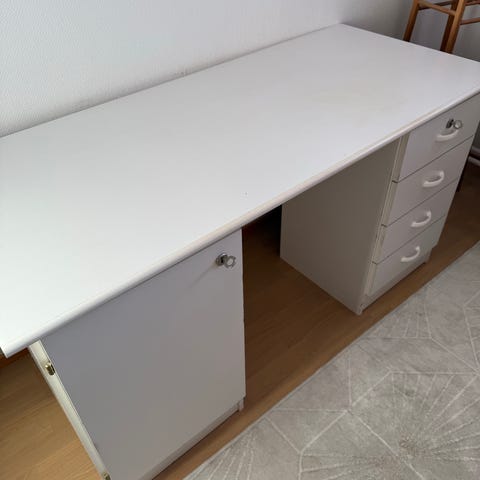 Annetaan kuvan mukainen meikki/työpöytä. On hieman pinttynyttä likaa laatikoissa sekä pinnoilla, mutta muuten hyvän kuntoinen. Vain nouto. Merkistä ei ole tietoa.