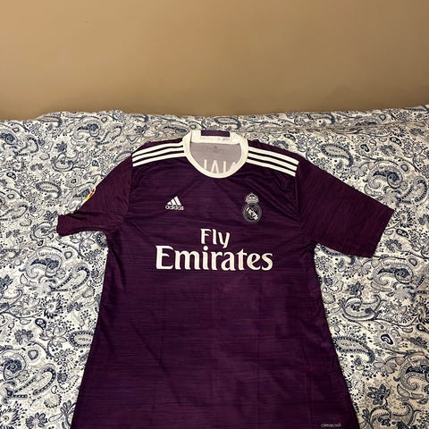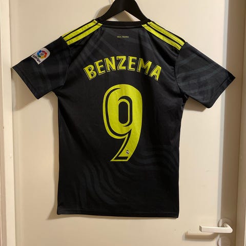 Adidas Real Madrid -jalkapallopaita. Paita on sininen, kuvioidulla pinnalla ja kultaisilla yksityiskohdilla. Edessä Real Madridin seuramerkki ja Adidas-logo.