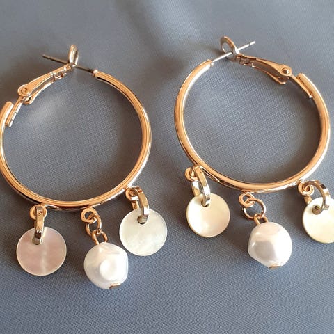 Pitkä pinkki simpukka kääty noin 123 cm, ei lukkoa, litteät helmet noin 13 mm ja noin 10 x 14 mm, paino noin 75 g. Vähän hienompi helmikoru, langassa solmut kivien välissä. Muhkean simpukka rannekorun sisäympärysmitta noin 14,5 cm, joustava mutta hoikkaan käteen, väri valkoinen, leveys noin 50 mm, paino noin 67 g. Hyväkuntoiset helmiäiskorut, molemmissa eläväinen luonnonmateriaali, valkoisen käsikorun sisäpuolella beigeä väriä ja kaulaketjun kivissä valkoisen, vaaleanpunaisen ja beigen sävyjä. Eivät ole kevyitä simpukankuorikoruja vaan melko painavia.