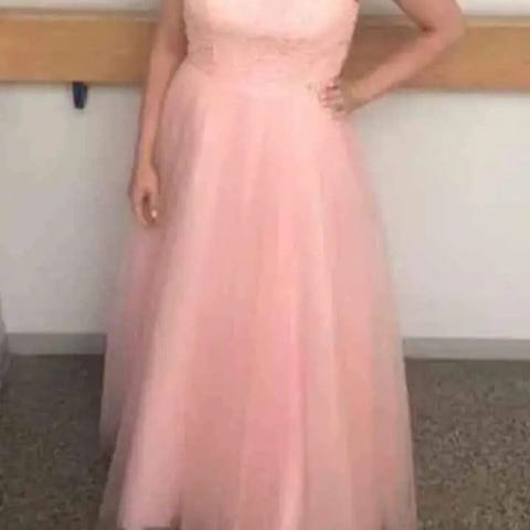 Vanhojentanssimekko. Uutena ostettu syksyllä 2025. Tanssittu helmikuussa 2026 vanhat. Käyttäjän pituus n.160cm. Halutessaan voi ostaa myös 110cm vannealushameen 45€. Mekko on kokoa S/36. Takana narut joilla pystyy säätämään paljon.