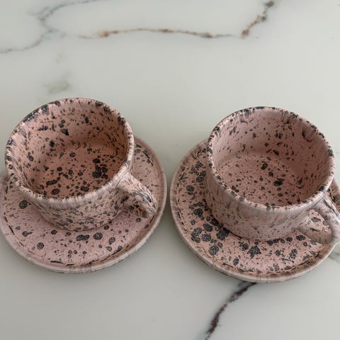 *4-piece white ceramic cup & saucer set* with a decorative rope‑rim finish. The cups have handles and are paired with matching saucers. Items are in excellent condition, no cracks or chips.