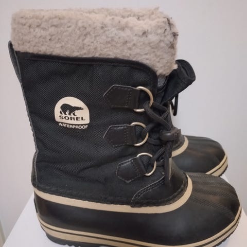 Sorel lasten talvikengät, koko 34, unisex-malli. Väri musta. Kengissä on lämmin vuori ja paksu, kuvioitu ulkopohja. Päällinen on vedenpitävä (waterproof) ja suunniteltu pitämään jalat kuivina kosteissa olosuhteissa. Sopivat sekä tytöille että pojille talvikäyttöön ja ulkoiluun.