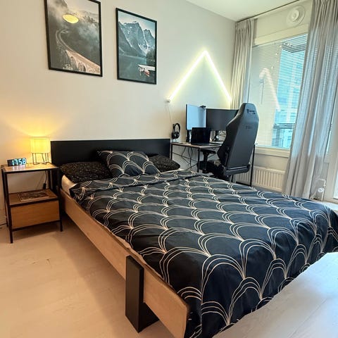 IKEA sänky ja patja. Kuvassa näkyy kahden hengen sänky, jossa on patja sekä päällä vuodevaatteet ja tyynyt. Sopii makuuhuoneeseen peruskäyttöön nukkumiseen ja lepoon. Tarkemmat mitat ja malli eivät käy ilmi kuvasta. Pelkää sängyn myydään ja hinnasta voi neuvotella