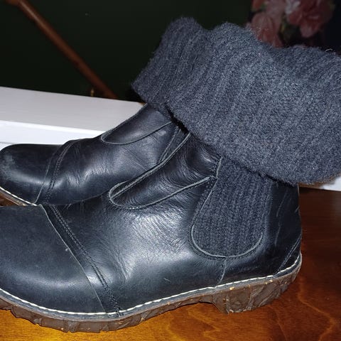 Naisten talvikengät, El Naturlista Yggrasil koko 37. Mustat nahkaiset nilkkapituiset kengät, joissa on paksu kumipohja ja joustava neulottu varsi. Todella siistit, vähänkäytetyt. Erittäin lämpöiset