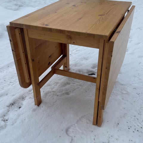 Vanha puinen ruokapöytä. Koko muunneltava, voi pitää kolmella eri tavalla. Käytön jälkiä löytyy, lähinnä toisessa klaffissa eli jäävät piiloon jos pitää sen puolen alhaalla.