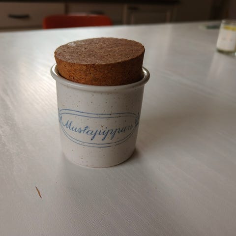 Pentik Valkopippuri - maustepurkki korkkikannella, korkeus 6,5cm, suun leveys 7cm. Ei kolhuja tms vikoja 8e