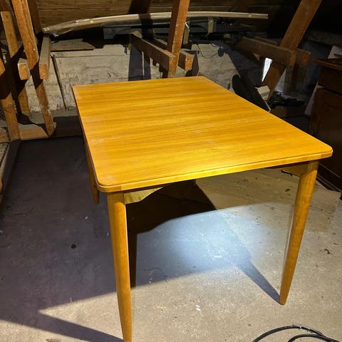 Hyväkuntoinen vanha pöytä ja tuolit. Kaikki täysin ehjiä. Pöydän halkaisija 115cm.