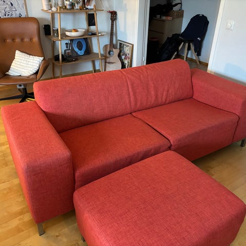 Ylimääräiseksi jäänyt sohva. Istuintyynyt irroitettavat, kiinni kaksipuolisella tarranauhalla. Yhtä jalkaa korjattu aikanaan. Vain Nouto. Nopein vie